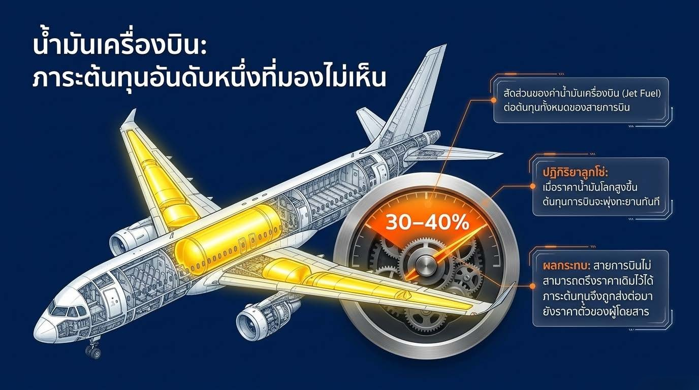 ต้นทุนหลักของสายการบิน ไม่ใช่แค่เครื่องบินหรือพนักงาน แต่คือ “น้ำมันเครื่องบิน (Jet Fuel)” ซึ่งคิดเป็นต้นทุนสูงถึง 30–40%