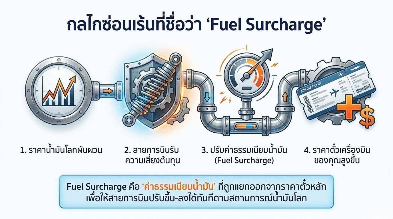 หลายคนอาจเคยเห็นคำว่า Fuel Surcharge ในราคาตั๋ว นี่คือ “ค่าธรรมเนียมน้ำมัน” ที่สายการบินเรียกเก็บเพิ่มจากราคาตั๋วปกติ