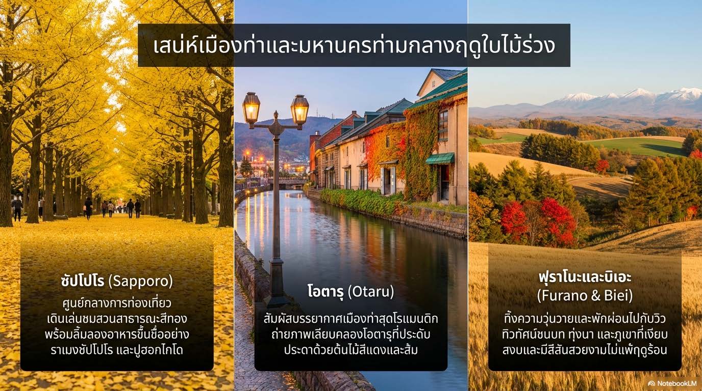 โปรแกรม ทัวร์ฮอกไกโด ใบไม้เปลี่ยนสี ส่วนใหญ่จะพาเที่ยวเมืองสำคัญหลายเมือง ซึ่งแต่ละเมืองมีเสน่ห์ที่แตกต่างกัน