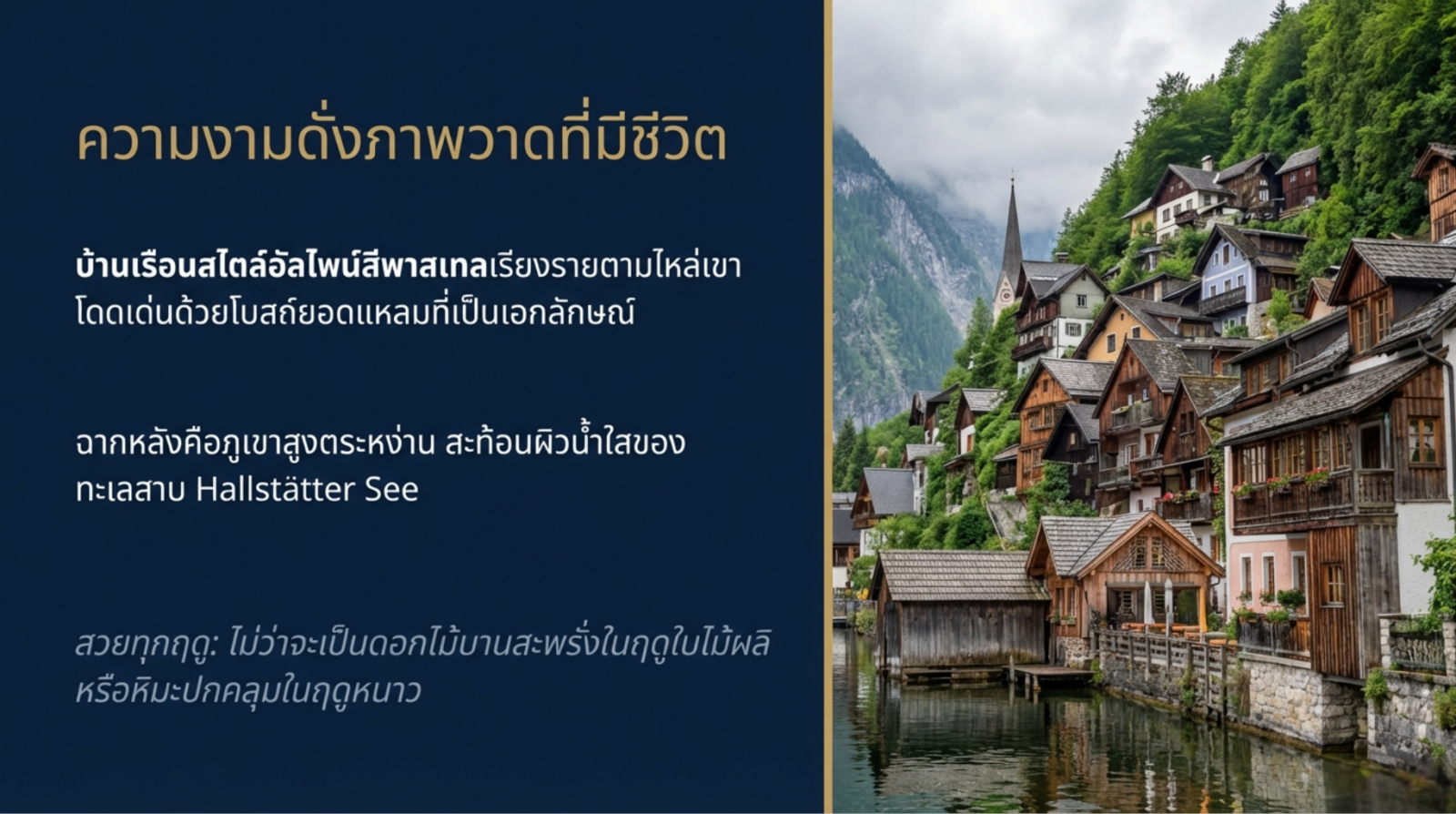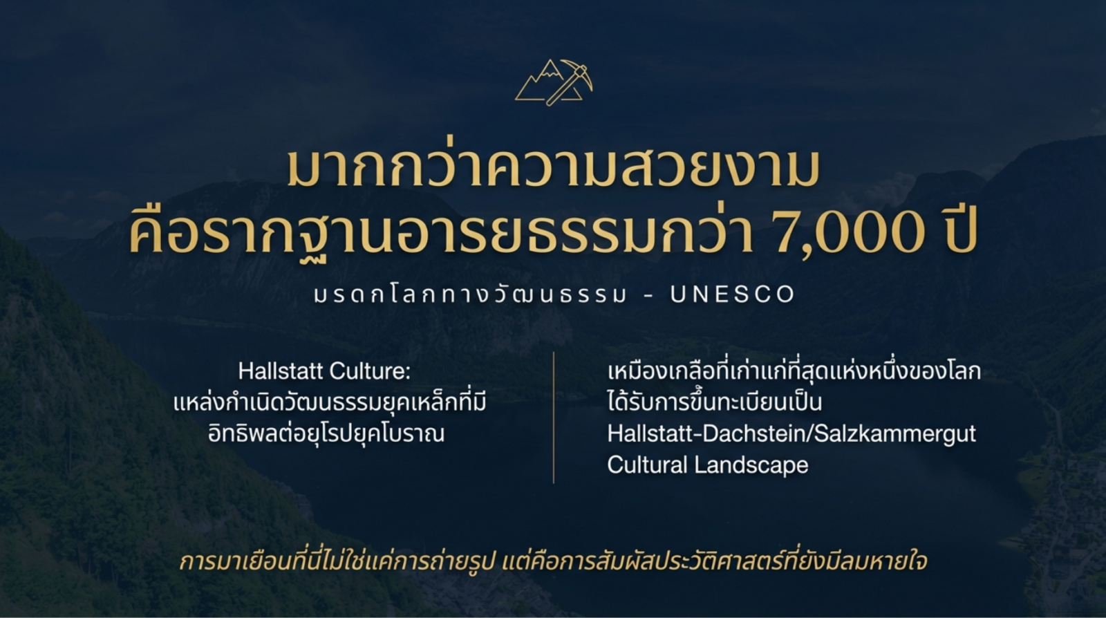 Hallstatt คือเมืองเล็ก ๆ ที่รวมทุกอย่างไว้ครบ ทั้งธรรมชาติ ประวัติศาสตร์ วัฒนธรรม และความโรแมนติก เป็นจุดหมายที่ช่วยเติมเต็มภาพฝันของการเดินทางยุโรปได้อย่างแท้จริง