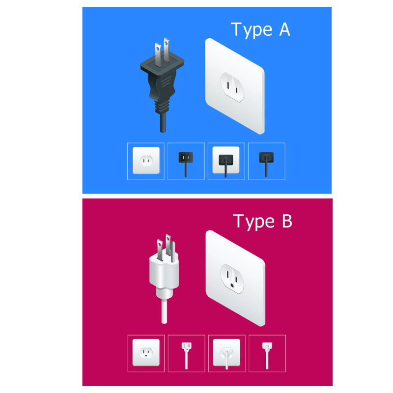 ปลั๊กไฟมาตรฐานที่ใช้กันอย่างแพร่หลาย รวมถึงในประเทศไทย มีลักษณะเป็นปลั๊กขั้วแบน 2 ขา ข้อสังเกต คือ ขั้วทั้ง 2 ของปลั๊ก Type A จะมีทั้งแบบที่ขนาดเท่ากัน และมีข้างใดข้างหนึ่งที่ใหญ่กว่า
