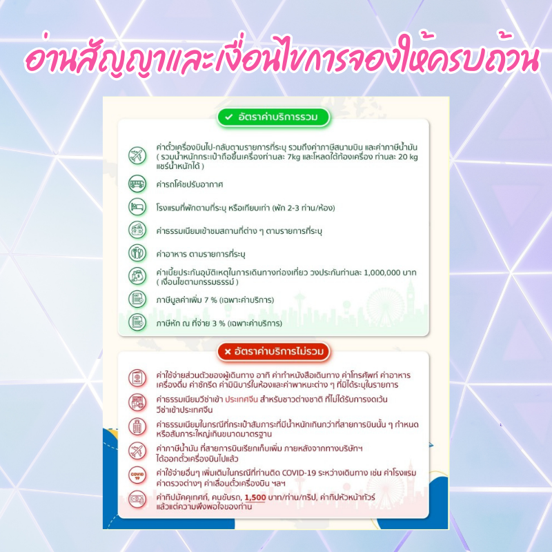 หลายคนมักข้ามการอ่านเงื่อนไขการจอง ทำให้เมื่อเกิดปัญหา เช่น ต้องการยกเลิกหรือเลื่อนวันเดินทาง ไม่สามารถขอเงินคืนได้ การเลือกบริษัททัวร์ที่มีการระบุเงื่อนไขอย่างชัดเจนและเป็นธรรม จะช่วยป้องกันความเสียหายที่อาจเกิดขึ้นในอนาคต