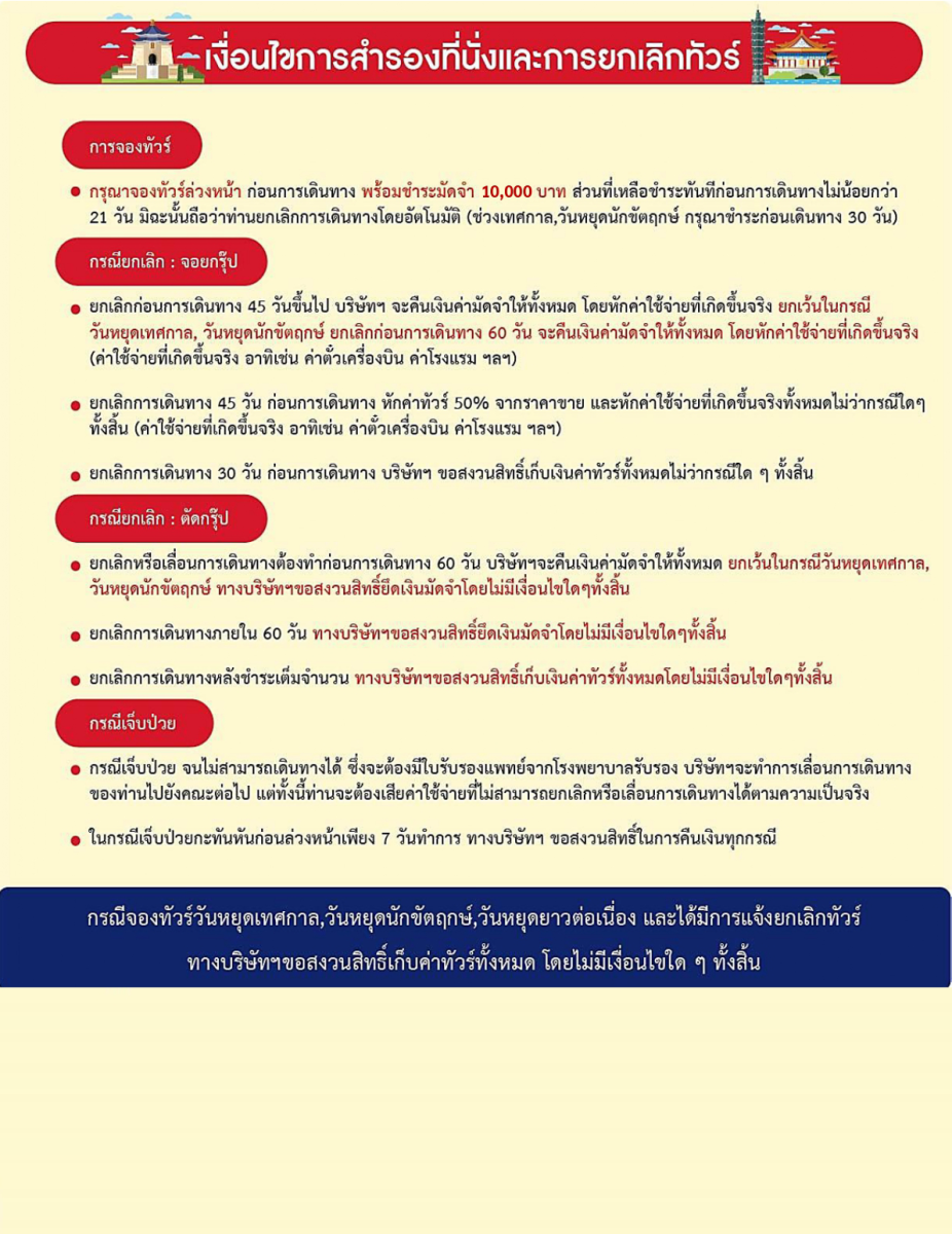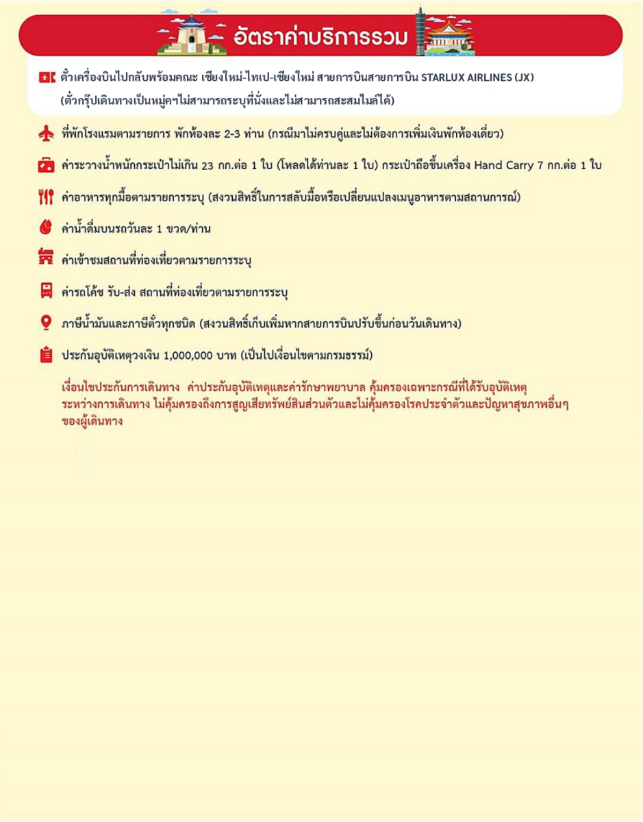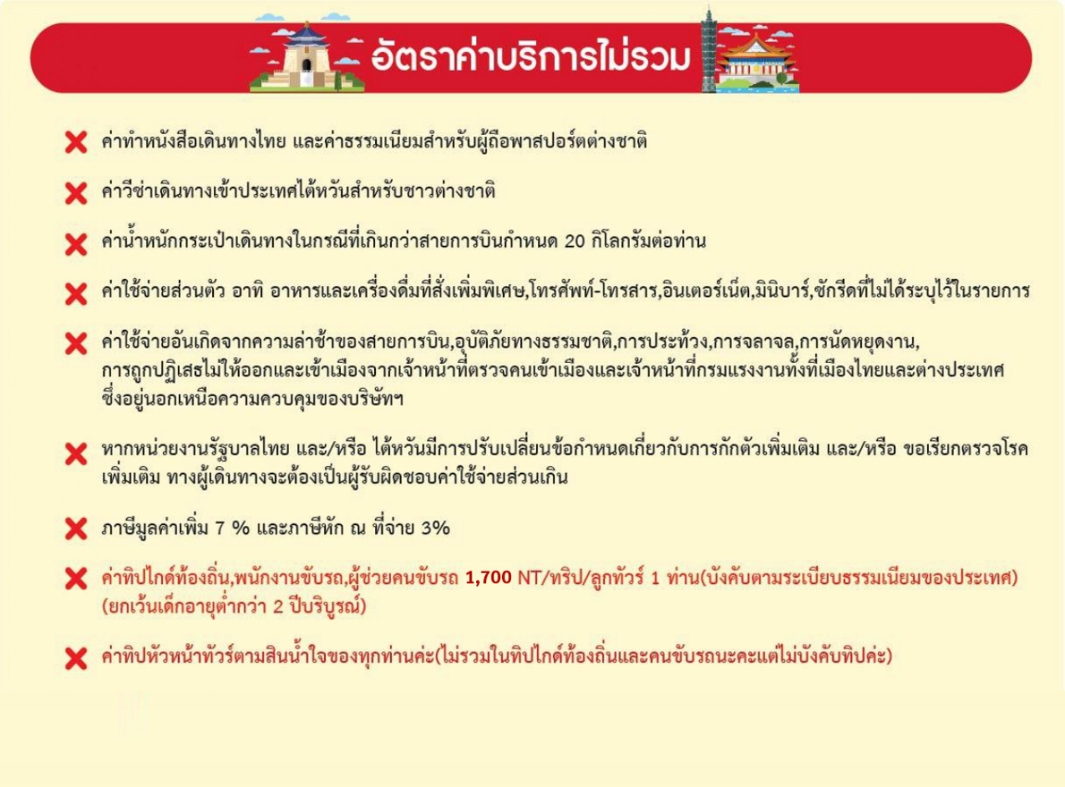 (โรงแรมที่ระบุในรายการทัวร์เป็นเพียงโรงแรมที่นำเสนอเบื้องต้นเท่านั้น ซึ่งอาจมีการเปลี่ยนแปลง ทั้งนี้โรงแรมที่เข้าพักจะเป็นโรงแรมในระดับเทียบเดียวกัน)