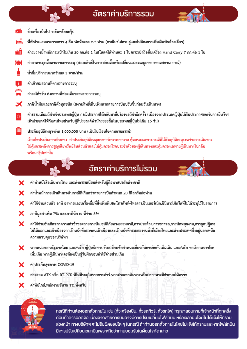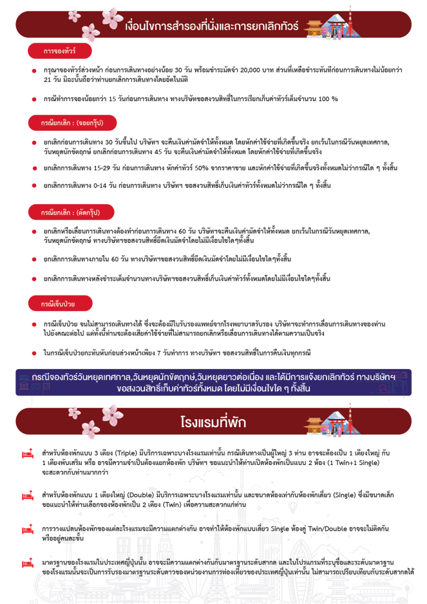 (โรงแรมที่ระบุในรายการทัวร์เป็นเพียงโรงแรมที่นำเสนอเบื้องต้นเท่านั้น ซึ่งอาจมีการเปลี่ยนแปลงแต่โรงแรมที่เข้าพักจะเป็นโรงแรมระดับเทียบเท่ากัน