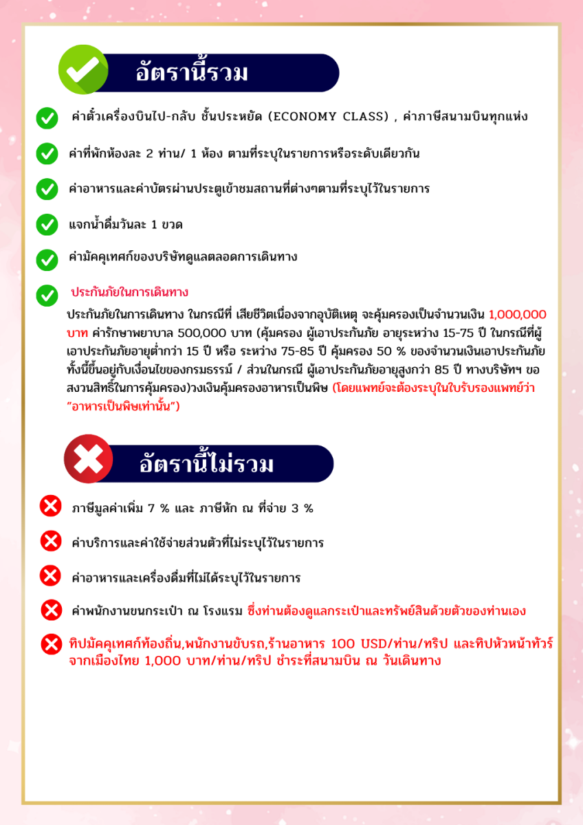 **ทางบริษัทขอสงวนสิทธิ์ในการซื้อ OPTIONAL TOUR ผ่านทางหัวหน้าทัวร์เท่านั้น ด้วยเหตุด้านความปลอดภัยของตัวท่านเอง และในเรื่องของการจัดการบริหารเวลาของกรุ๊ปทัวร์ ขอขอบพระคุณทุกท่านในการให้ความร่วมมือ**