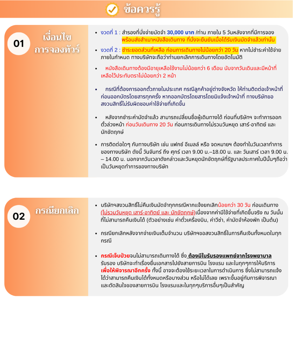 *** เที่ยวบินหรือเวลาอาจมีการเปลี่ยนแปลง ทั้งนี้ขึ้นอยู่กับสายการบินเป็นผู้กำหนด *** ขอสงวนสิทธิ์ในการเลือกที่นั่งบนเครื่องบินเนื่องจากเป็นตั๋วกรุ๊ป การจัดที่นั่งเป็นระบบ RANDOM ไม่สามารถเลือกที่นั่งได้ ที่นั่งอาจจะไม่ได้นั่งติดกัน ทั้งนี้เป็นไปตามเงื่อนไขของสายการบิน