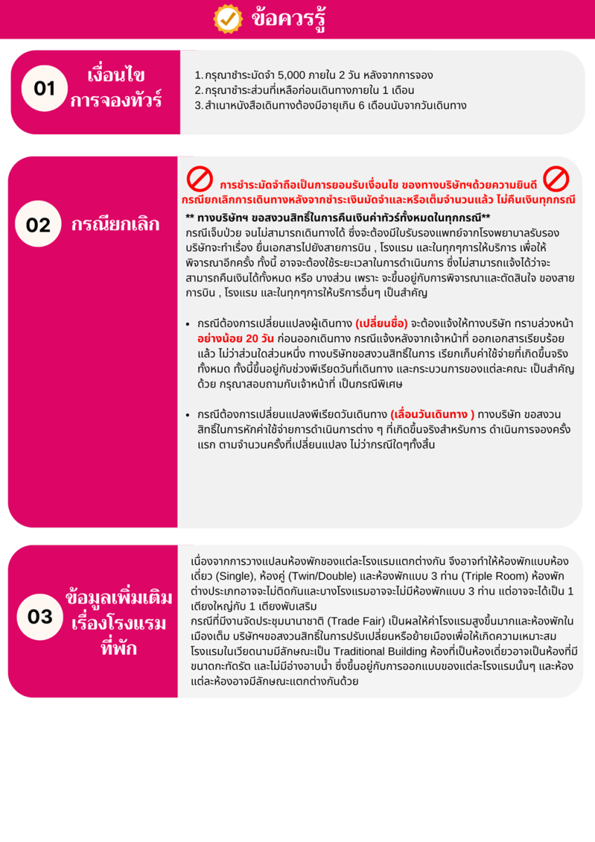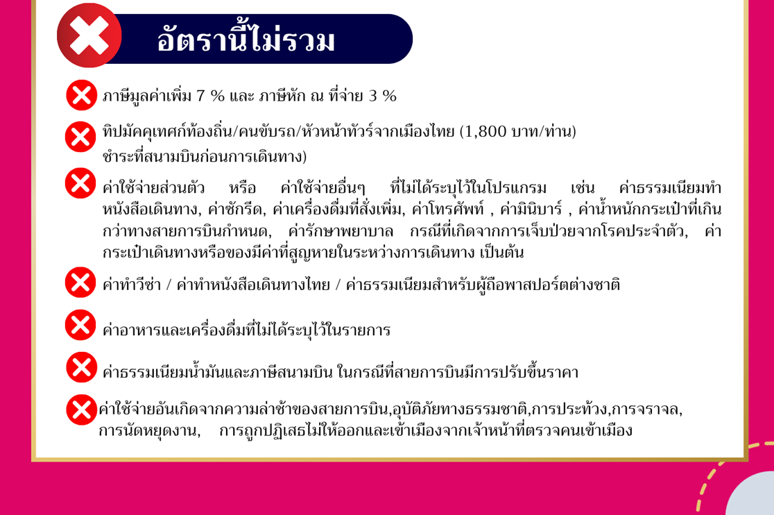 23.30 น. ออกเดินทางกลับ กรุงเทพฯ โดยสายการบิน เอมิเรตส์ (EK) เที่ยวบินที่ EK371