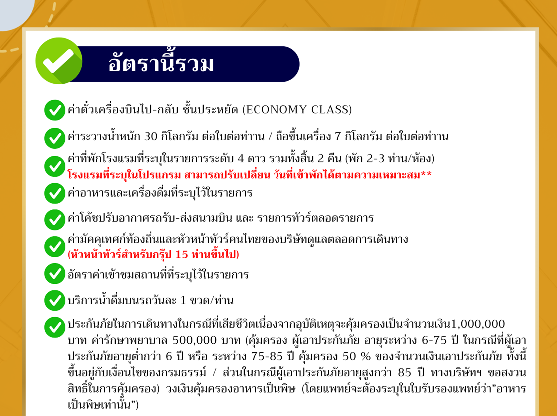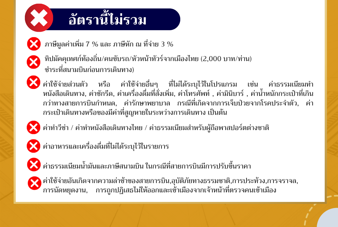 | 24 เม.ย. 69 - 26 เม.ย. 69 | 7,999 บาท | 1,500 บาท | 7,999 บาท | |