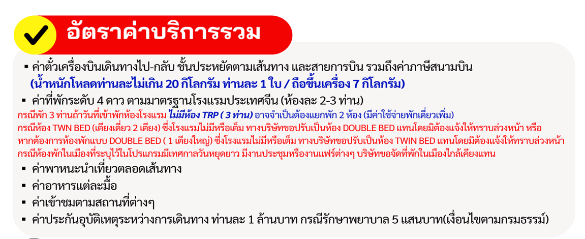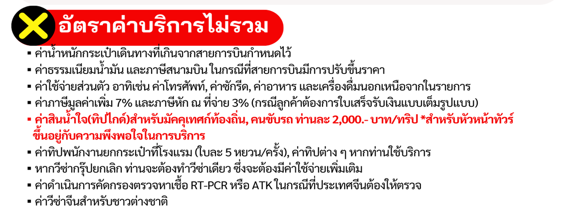 | 06 ก.ค. 69 - 09 ก.ค. 69 | 12,998 บาท | 3,500 บาท | สอบถามเพิ่มเติม | จอง |