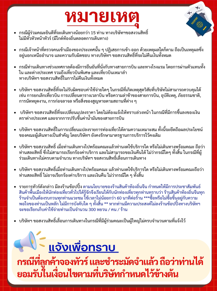 หากคณะไม่สามารถเดินทางไปชมอุทยานได้ ไม่ว่าเนื่องจากสภาพอากาศ หรือเหตุผลใดๆ ก็ตาม ทางบริษัทฯ ขอสงวน ไม่ต้องแจ้งให้ทราบล่วงหน้า หรือสถานที่เที่ยวอื่นแทน