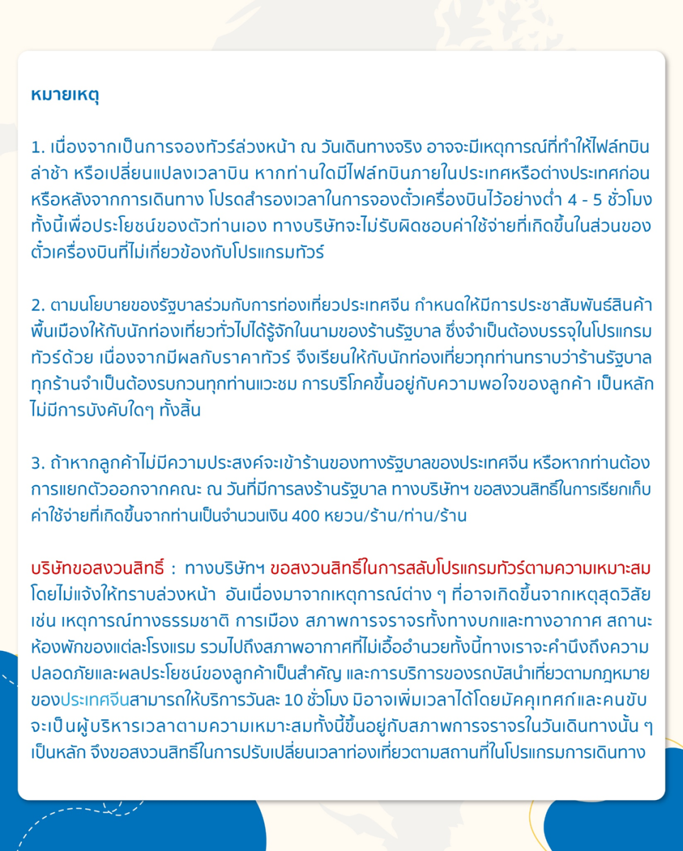 | 15 ส.ค. 69 - 18 ส.ค. 69 | 14,918 บาท | 3,000 บาท | สอบถามเพิ่มเติม | จอง |